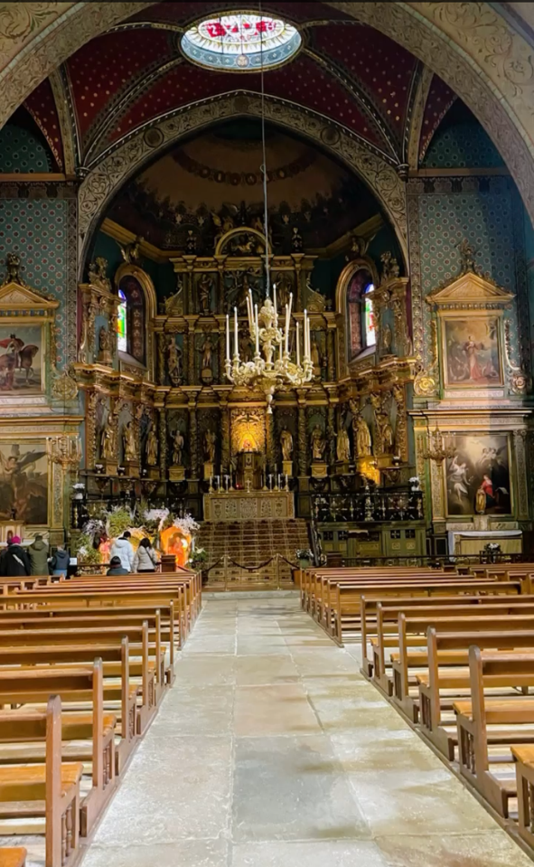 Église Saint-Jean-Baptiste de Saint-Jean-de-Luz(サン=ジャン=ド=リュズのサン=ジャン=バティスト教会)ルイ14世とスペインの王女との結婚式が行われたあたたかい雰囲気の赤いステンドグラスの素敵な教会。ルイ.14世が通られたドアは永遠に誰も通らないようにと封印されていました。